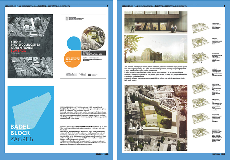 "Ovom prilikom vrijedi se prisjetiti i natječaja za Blok Badel kojim je započela realizacija Urbanističkog plana uređenja Vlaška – Šubićeva– Martićeva – Derenčinova. Bio je to anketni natječaj za izradu idejnog urbanističko- arhitektonskog rješenja. Predaja radova organizirana je putem interneta te su pristigla nezamisliva dvjesto četrdeset i dva natječajna rada iz čitavog svijeta, a pobijedilo je rješenje portugalskog biroa Pablo Pita Architects. Koncept rada temeljio se na izrazitoj definiranosti bloka mješovite namjene, naglašene izgrađenosti istaknutih volumena, njegovoj slobodnoj, zelenoj i javnoj jezgri koja je javnim prolazima povezana s okolnim gradskim prostorom.