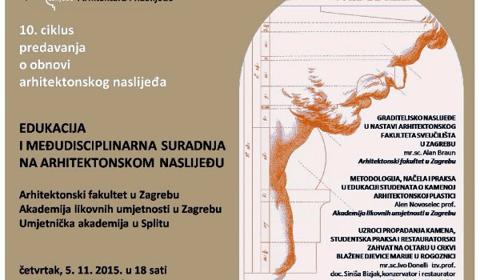 Društvo arhitekata Zagreba poziva Vas na predavanje iz X ciklusa Arhitektura i naslijeđe Društva arhitekta Zagreba: "EDUKACIJA I MEĐUDISCIPLINARNA SURADNJA NA ARHITEKTONSKOM NASLIJEĐU" koje će se održati 05. 11. 2015. u 18 sati u prostorijama DAZ-a, Trg bana Josipa Jelačića 3/1.